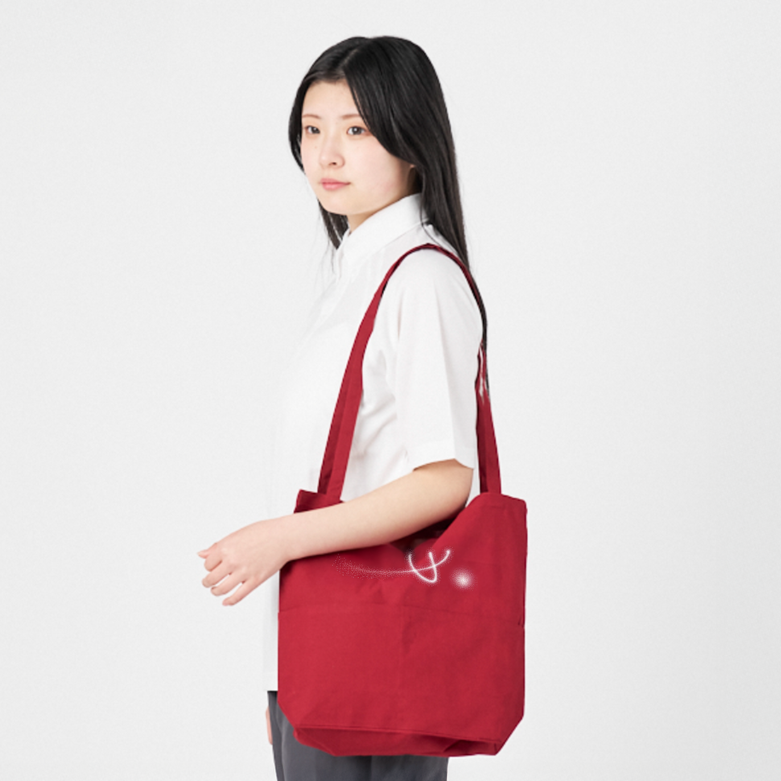 持ち手が長く肩掛けしやすいのがポイント。また、外ポケットが2つ付いており、スマートフォンなど使用頻度が高い物を収納したい時に便利です。必要な時に、すぐ取り出すことが出来ます。使用されている5オンスのコットン生地は、シーチング生地よりも透けにくいという特徴があります。適度に厚みもあるため耐久性に優れており、毎日使う場合でも問題ありません。カラーは全4色展開されています。