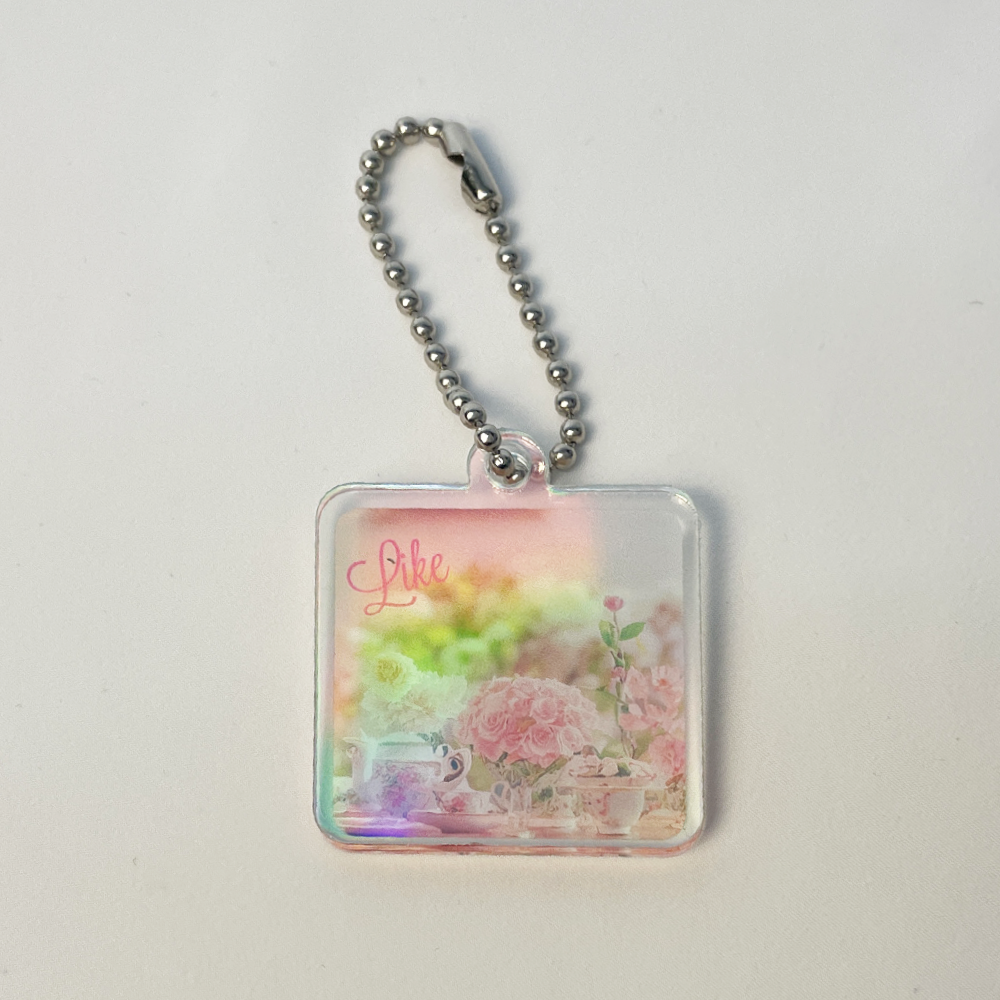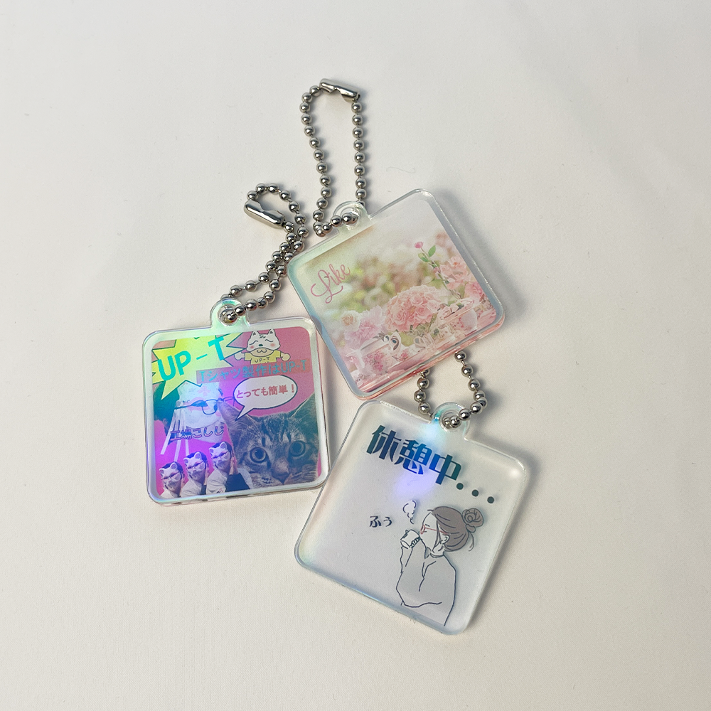 ホログラムのフィルムで加工されたアクリルキーホルダー
