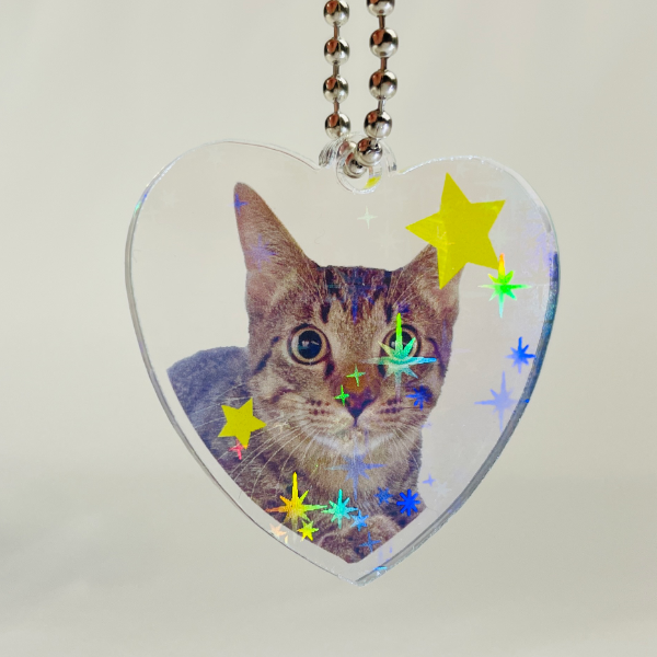 ホログラムアクリルキーホルダー(ハート型)4cm キラキラスターのレビューと制作事例