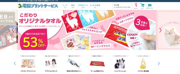 電脳プリントサービスは、タオルをはじめ、全アイテム1点から注文可能です。