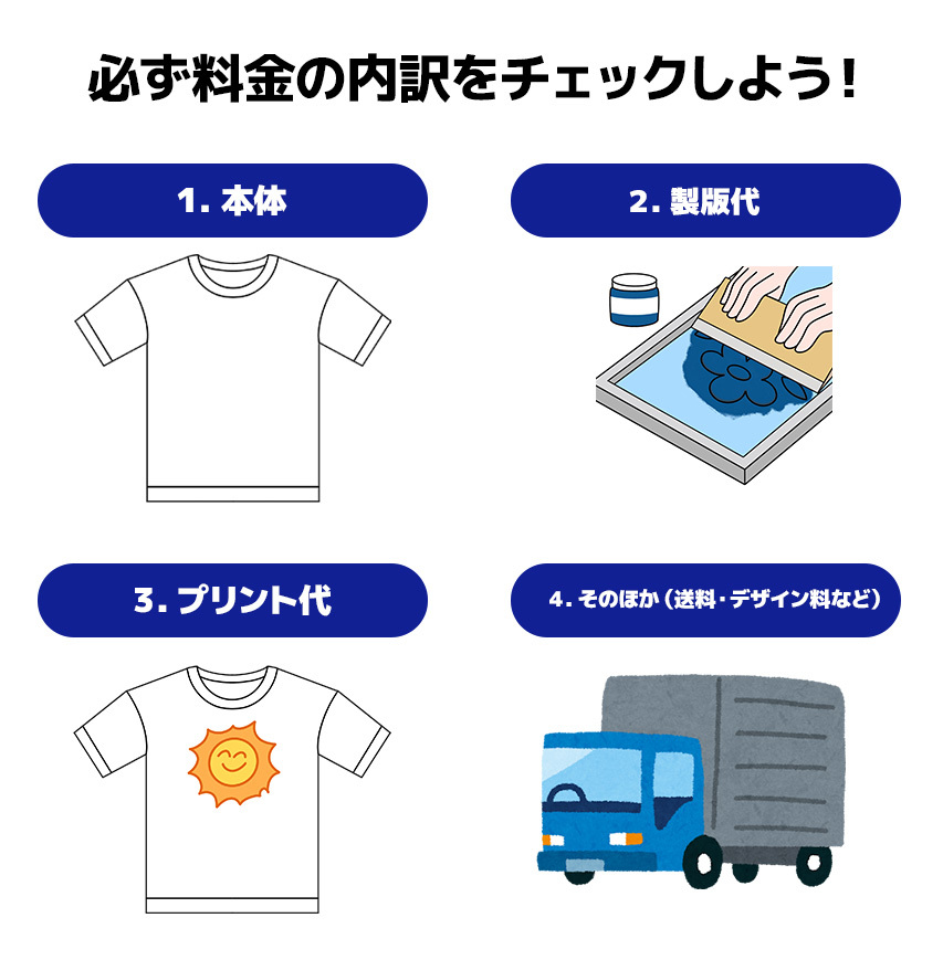 実際の料金は「ボディ代」「プリント代」「版代(型代)」の組み合わせで決まり、デザインの色数やプリント位置によっても変動します。