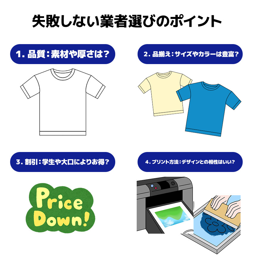価格はもちろん、送料や発送にかかる時間、割引などをチェックして、しっかりとオリジナルTシャツ業者を選びましょう。