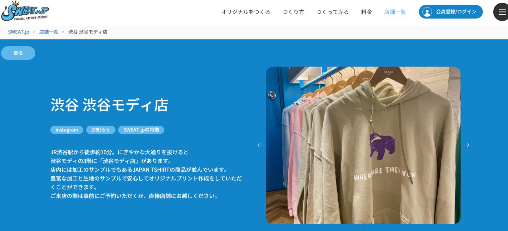SWEAT.jpは東京や大阪、京都など1都2府6県に展開しており、その中の1店舗が渋谷モディ店です。