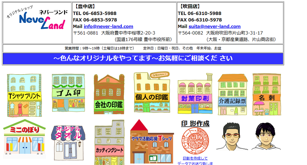 ネバーランド吹田店は、大阪・京都産業道路沿いの片山商店街に店舗を構え、Tシャツプリントを初め、ゴム印・会社や個人の印鑑・名刺などを制作しています。