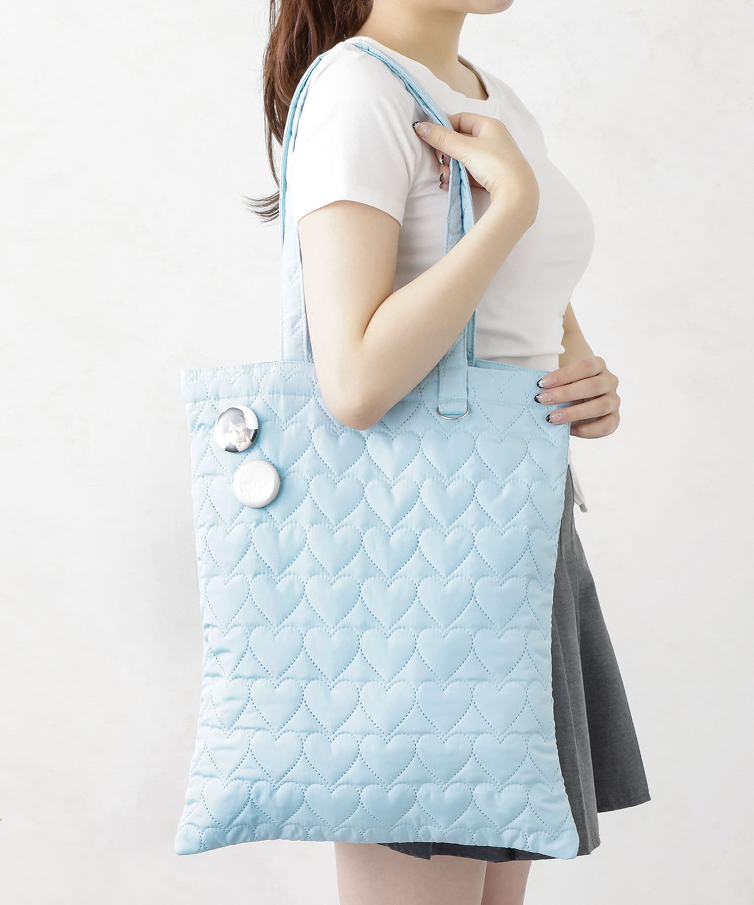 ステッチでバッグいっぱいに描いたハート柄がかわいらしく、優しいデザインです。