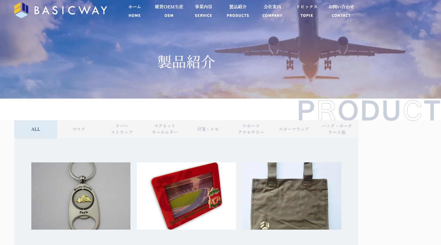 中国でのOEM雑貨生産に特化し、バッグ、ポーチ、文房具、キーホルダー、マスク、スポーツ用品など多彩なアイテムに対応。