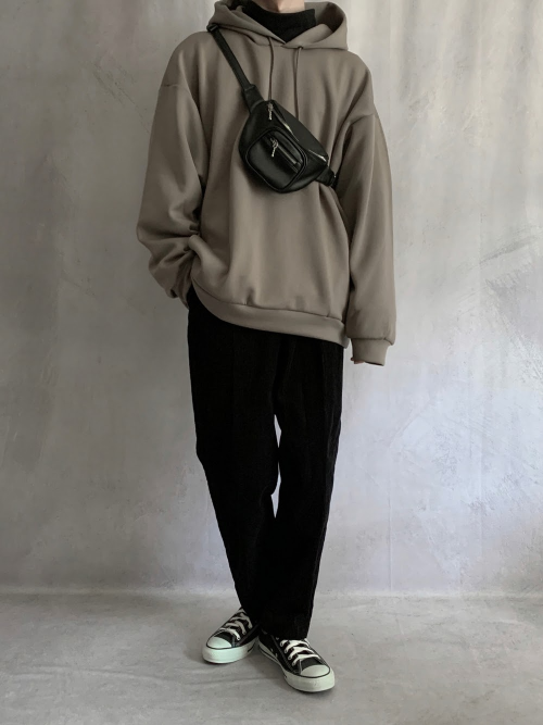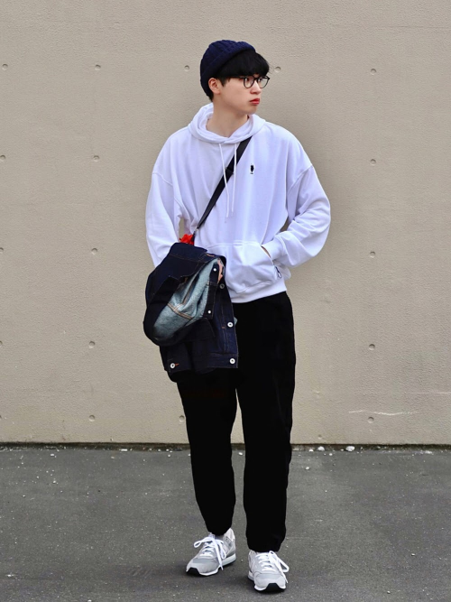 パーカーがオーバーサイズの時は細身のボトムス、ジャストサイズの時はゆったりめのボトムスを合わせるのがおすすめです。