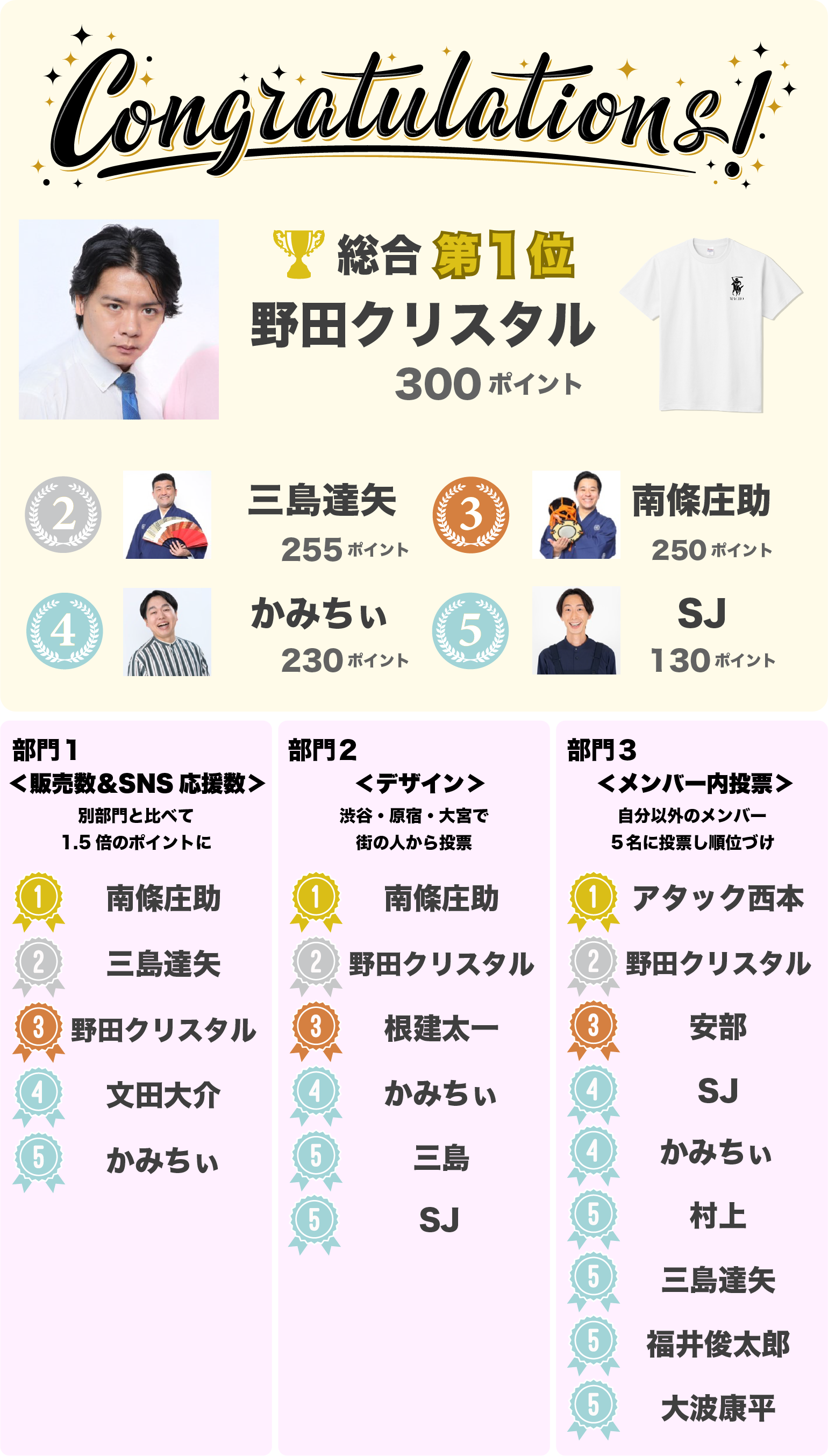 グランプリを獲得するには基本的にはTシャツの販売枚数が影響します。Tシャツを1点購入するごとに100ptのランキングポイントが加算されます。