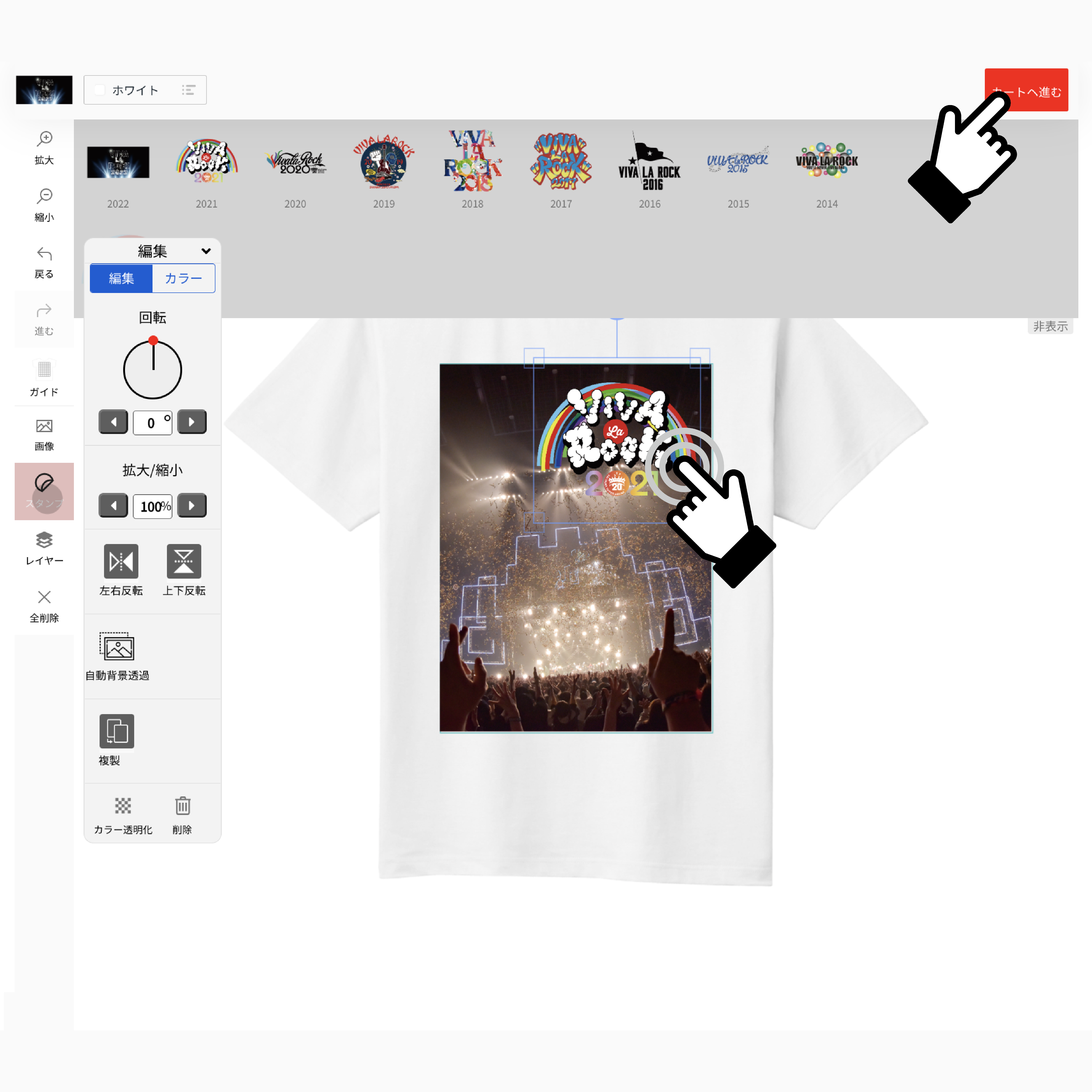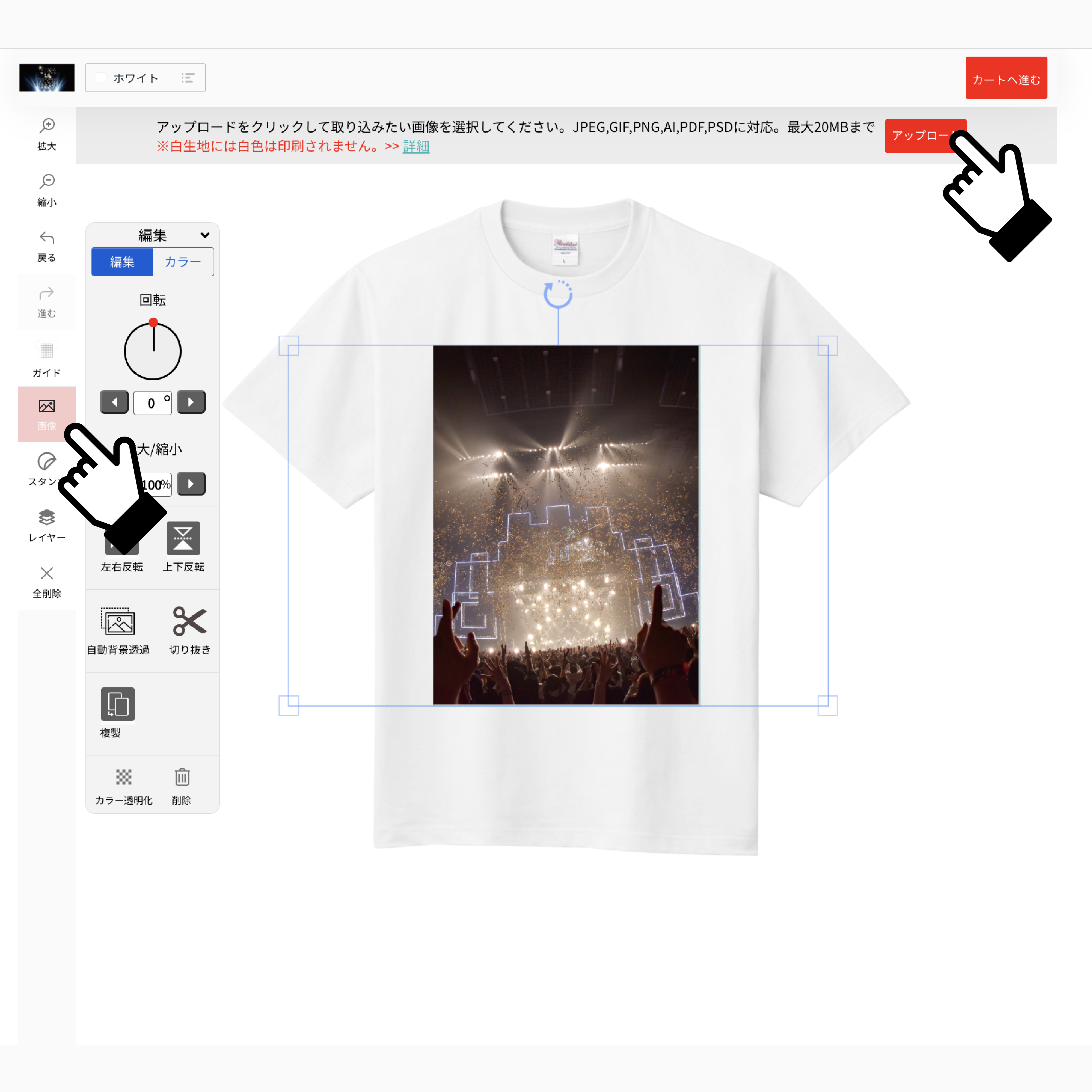 お好きな配置にデザインが完了したら「カートへ進む」をクリック